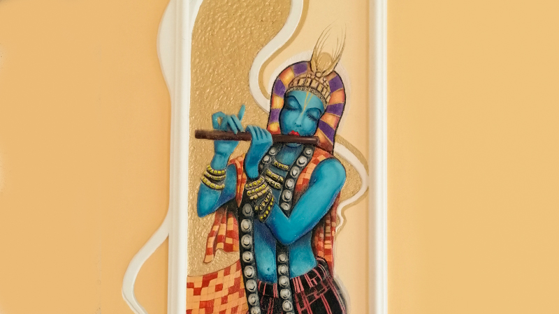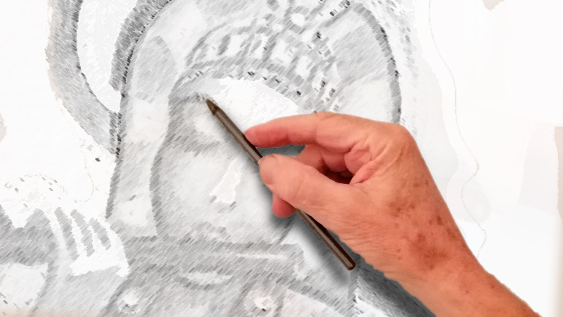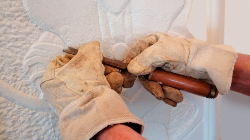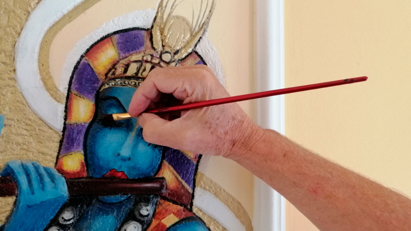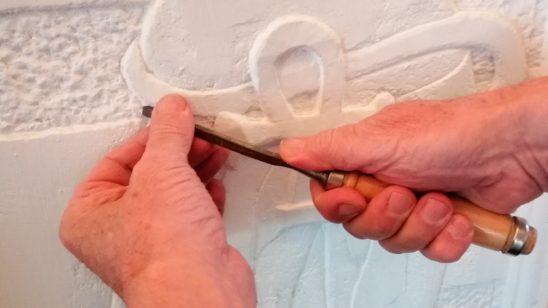 Die vorgezeichneten Motive werden direkt in frischen, noch relativ weichen Reliefwandputz ziseliert, bemalt und anschließend hart versiegelt.